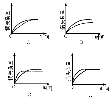 將ag塊狀碳酸鈣跟足量鹽酸反應(yīng),反應(yīng)物損失的質(zhì)量隨時間的變化曲線下圖的實線所示;在相同的條件下,將bg(a>b)粉末狀碳酸鈣與同濃度鹽酸應(yīng),則相應(yīng)的曲線如下圖的虛線所示.其中正確的是