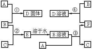 如下圖所示:黑色固體A有以下轉(zhuǎn)化關(guān)系,每個方框表示有一種反應(yīng)物或生成物(反應(yīng)條件及生成的水已略去),其中C、F常溫下為無色氣體,D、E有共同的陽離子.