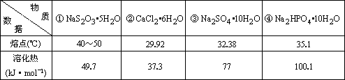 一些鹽的結(jié)晶水合物,在溫度不太高時(shí)就有熔化現(xiàn)象,即熔溶于自身的結(jié)晶水中,又同時(shí)吸收熱量.它們?cè)谒芰洗薪?jīng)日曬就熔化,又在日后緩慢凝結(jié)而釋放熱量.故可用于調(diào)節(jié)室內(nèi)的溫度,或作夏日防暑用枕墊或座墊,這些物質(zhì)可稱(chēng)之為潛熱材料.現(xiàn)有幾種鹽的結(jié)晶水合物有關(guān)數(shù)據(jù)如下: