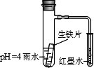 下圖裝置中,小試管內(nèi)為紅墨水,具支試管內(nèi)盛有pH=4的雨水和生鐵片.觀察:開始導管內(nèi)液面下降,一段時間后導管內(nèi)液面回升,略高于小試管液面.以下有關(guān)解釋合理的是