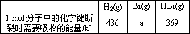 已知H2(g)+Br2(l)=2HBr(g);ΔH=-72 kJ/mol.蒸發(fā)1 mol Br2(l)需要吸收的能量為30 kJ,其它相關(guān)數(shù)據(jù)如下表: