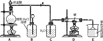Cl2通過(guò)C瓶后進(jìn)入D,D裝置內(nèi)盛有碳粉,發(fā)生氧化還原反應(yīng),生成CO2和HCl,寫出D裝置中反應(yīng)的化學(xué)方程式________;裝置C的作用是________.