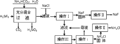 氟化鈉是一種重要的氟鹽,主要用作農(nóng)業(yè)殺菌劑、殺蟲(chóng)劑、木材防腐劑和生產(chǎn)含氟牙膏等.實(shí)驗(yàn)室可通過(guò)下圖所示的流程以氟硅酸(H2SiF6)等物質(zhì)為原料制取氟化鈉,并得到副產(chǎn)品氯化銨:
