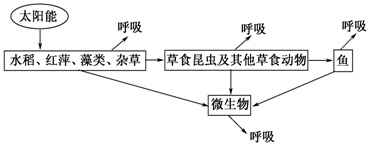 (4)畫出稻一萍一魚生態(tài)系統(tǒng)的能量流動圖(不考慮與人的聯(lián)系)。