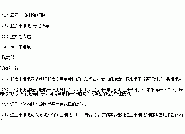 (2)分化程度最低的干細胞是 。在體外培養(yǎng)條件下,培養(yǎng)液中加入 因子,可誘導該種干細胞向不同類型的組織細胞分化。