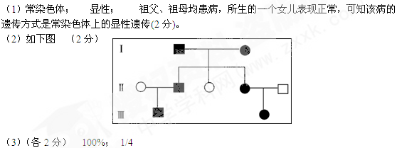 (09惠州市三調(diào))(10分)在尋找人類的缺陷基因時,常常需要得到有患病史的某些近親結(jié)婚家系的系譜進(jìn)行功能基因定位?茖W(xué)家在一個海島的居民中,找到了引起藍(lán)色盲的基因。該島約有44%的居民為藍(lán)色盲基因的攜帶者。在世界范圍內(nèi),則是每10000人中有1名藍(lán)色盲患者。