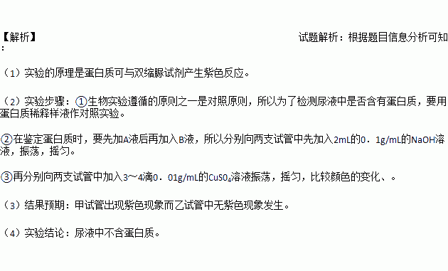 實(shí)驗(yàn)用品:新取尿液樣品、清水、0.1g/mL的NaOH溶液、0.01 g/mL的CuS04溶液、蛋白質(zhì)稀釋樣液、試管和滴管等。