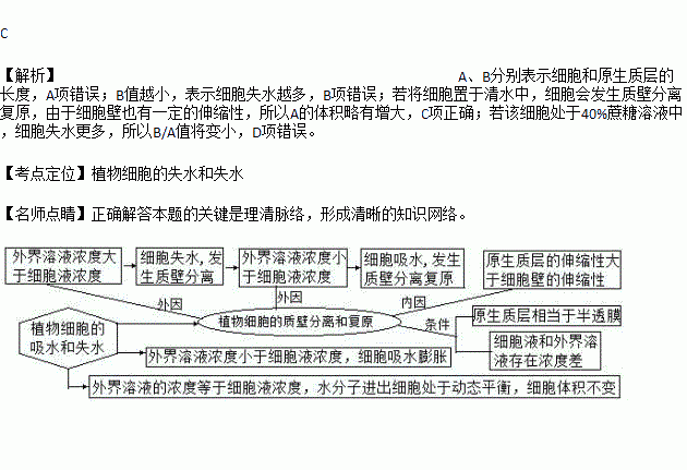 D. 若該細胞處于40%蔗糖溶液中,B/A值將變大