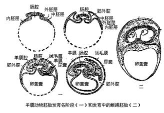 在胚胎發(fā)育期間,胚胎本身還發(fā)生一系列保證能在陸地上完成發(fā)育的適應(yīng),即產(chǎn)生三種重要的胚膜:羊膜、絨毛膜和尿囊膜。
