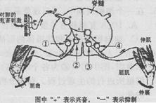 —只腳踩在釘子上,馬上引起腿的收縮以避開損傷性刺激的繼續(xù)作用,而另一條腿迅速伸直以支持身體,使身體不會(huì)跌倒。下圖表示這一復(fù)雜反射的過程。圖示表明: