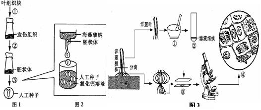 下圖1為人工種子生產(chǎn)過程示意圖,圖2為圖1中③過程的相關操作,圖3是與洋蔥有關實驗的部分步驟,據(jù)圖分析回答: