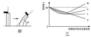某研究小組探究避光條件下生長素濃度對燕麥胚芽鞘生長的影響。胚芽鞘去頂靜置一段時間后,將含有不同濃度生長素的瓊脂塊分別放置在不同的去頂胚芽鞘一側,一段時間后測量并記錄彎曲度(α)。下圖中甲為實驗示意圖。乙圖曲線中能正確表示實驗結果的是
