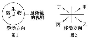 使用普通光學(xué)顯微鏡觀察水中微生物,若發(fā)現(xiàn)視野中微生物如圖1所示方向游走,請(qǐng)問(wèn)應(yīng)該把載玻片向圖2所示的哪個(gè)方向移動(dòng)( )