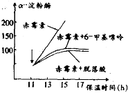 淀粉酶的合成中的相互作用如右圖。6-甲基嘌呤是mRNA合成的抑制劑,抑制劑在第11h加入(見圖中“↓”)。請根據(jù)圖中信息和相關(guān)知識分析,不能得出的結(jié)論是