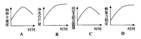一塊棄耕的農(nóng)田,很快長(zhǎng)滿雜草,幾年后,草本植物開(kāi)始減少,各種灌木卻繁茂起來(lái),最后這塊農(nóng)田演變成了一片森林。這片森林在不受外力干擾的情況下將會(huì)長(zhǎng)期占據(jù)那里,成為一個(gè)非常穩(wěn)定的生態(tài)系統(tǒng)。該生態(tài)系統(tǒng)在此演變過(guò)程中,相關(guān)變化趨勢(shì)正確的是