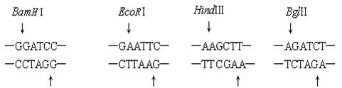 限制酶是一種核酸切割酶,可辨識并切割DNA分子上特定的核苷酸堿基序列。下圖為四種限制酶BamHI,EcoRI,HindⅢ以及BglⅡ的辨識序列。箭頭表示每一種限制酶的特定切割部位,其中哪兩種限制酶所切割出來的DNA片段末端可以互補黏合?( )