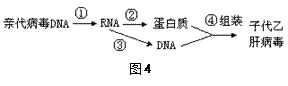 乙肝病毒是一種約由3200個(gè)脫氧核苷酸組成的雙鏈DNA病毒,這種病毒的復(fù)制方式較為特殊,簡(jiǎn)要過(guò)程如圖4所示。