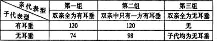 B.從第三組的調(diào)查結(jié)果基本可以判斷出,隱性性狀是無耳垂