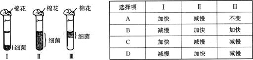 用培養(yǎng)液培養(yǎng)3種細(xì)菌,讓它們在3支不同的試管中生長,下圖顯示了細(xì)菌的生長層。如果此時(shí)往3支試管中通入氧氣,則細(xì)菌的繁殖速度可能發(fā)生的變化是 ( )