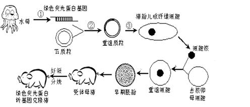 2008年諾貝爾化學獎授予了三位在研究綠色熒光蛋白(GFP)方面做出突出貢獻的科學家。綠色熒光蛋白能在藍光或紫外光的激發(fā)下發(fā)出熒光,這樣借助GFP發(fā)出的熒光就可以跟蹤蛋白質在細胞內部的移動情況,幫助推斷蛋白質的功能。下圖為我國首例綠色熒光蛋白(GFP)轉基因克隆豬的培育過程示意圖,據(jù)圖回答: