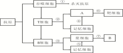 下圖為人體免疫部分過(guò)程示意圖。請(qǐng)據(jù)圖回答(括號(hào)中填圖中編號(hào),橫線上填文字)。
