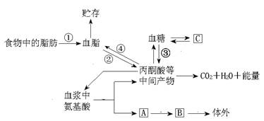 D.圖中A、B、C名稱依次是含氮部分、尿素、肝糖元
