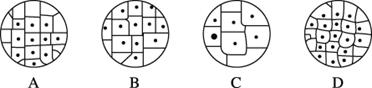 若用一顯微鏡觀察同一標(biāo)本4次,每次僅調(diào)整目鏡或物鏡和細(xì)準(zhǔn)焦螺旋,結(jié)果如下圖所示。試問其視野最暗的是 ( )