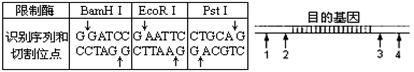 下表為幾種限制性核酸內(nèi)切酶識(shí)別的序列和切割的位點(diǎn)。如圖,已知某DNA在目的基因的兩端1、2、3、4四處有BamHⅠ或EcoRⅠ或PstⅠ的酶切位點(diǎn),F(xiàn)用BamHⅠ和EcoRⅠ兩種酶同時(shí)切割該DNA片段(假設(shè)所用的酶均可將識(shí)別位點(diǎn)完全切開),下列各種酶切位點(diǎn)情況中,可以防止酶切后單個(gè)含目的基因的DNA片段自身連接成環(huán)狀的是( )