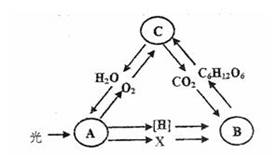 (09上海十四校聯(lián)考)下圖為綠色植物體內(nèi)某些代謝過程中物質(zhì)變化的示意圖,A、B、C分別表示不同代謝過程。以下表達(dá)正確的是