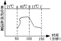 (09湖北三校三月聯(lián)考)下圖表示某人在休息時,單位時間內(nèi)流經(jīng)其單位面積皮膚血管內(nèi)血液的相對流量,在時刻A,室內(nèi)溫度由15℃突升至40℃,在時刻B,室內(nèi)溫度又突降至15℃,下列說法正確的是: