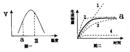 下圖一表示溫度對酶促反應速率的影響示意圖,圖二的實線表示在溫度為a的情況下生成物量與時間的關系圖。則當溫度增加一倍時生成物量與時間的關系是