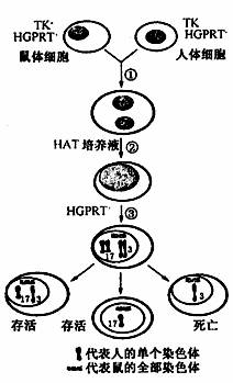 運(yùn)用動(dòng)物體細(xì)胞雜交技術(shù)可實(shí)現(xiàn)基因定位。研究發(fā)現(xiàn):用人的細(xì)胞與小鼠體細(xì)胞進(jìn)行雜交得到的雜種細(xì)胞含有雙方的染色體。雜種細(xì)胞在持續(xù)分裂過程中僅保留鼠的染色體而人類染色體則逐漸丟失,只剩一條或幾條。下圖是人的缺乏HGPRT酶突變細(xì)胞株(HGPRT - )和小鼠的缺乏TK酶細(xì)胞株(TK-)融合后并在 HAT 培養(yǎng)液中培養(yǎng)的過程,結(jié)果表明最終人的染色體在融合細(xì)胞中僅存有3號(hào)染色體或17號(hào)染色體或兩者都有。已知只有同時(shí)具有HGPRT酶和TK酶的融合細(xì)胞才可在HAT培養(yǎng)液中長期存活與繁殖。