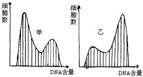 甲圖表示某種哺乳動物細(xì)胞在正常培養(yǎng)時,所測得的細(xì)胞中DNA含量在整個細(xì)胞群體中的分布情況。當(dāng)用某種化合物處理該細(xì)胞并培養(yǎng)幾小時,DNA含量的分布如圖乙所示,該化合物所起的作用是
