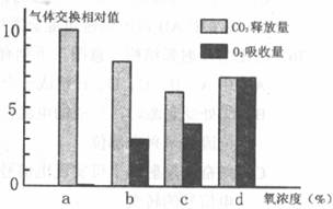 下圖表示某高等植物的某一非綠色器官在氧氣濃度分別為a、b、c、d時,二氧化碳釋放量和氧氣吸收量的變化。下列相關(guān)敘述正確的是