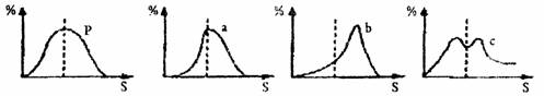 在l.5×108 年前(用150MaBP 表示)的沉積物中發(fā)現(xiàn)了已滅絕的劍尾動物。對每個個體背甲的長寬比都進行了測量。長寬的比值用S 值表示。在下圖中,P 曲線表示150MaBP 時該動物S 值的分布,在l00MaBP 的沉積物中,在3個不同地點發(fā)現(xiàn)了3個不同劍尾動物的群體。