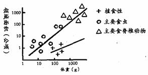 動物為保證食物等生存資源而占據(jù)的空間叫領(lǐng)域。下圖表示各種鳥類的領(lǐng)域面積與體重、食性的關(guān)系,據(jù)圖分析正確的是 ( )