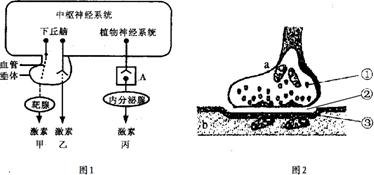 圖1為中樞神經(jīng)系統(tǒng)對內(nèi)分泌功能的調節(jié)有甲、乙、丙三種方式,圖2是圖1中A結構的放大圖。請據(jù)圖回答: