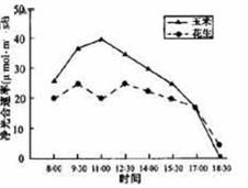 C. 在11:00~12:30之間,花生的單位葉面積有機(jī)物積累量比玉米的多