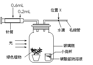 右圖是探究綠色植物光合作用速率的實(shí)驗(yàn)示意圖,裝置中的碳酸氫鈉溶液可維持瓶?jī)?nèi)的二氧化碳濃度。該裝置放在20℃環(huán)境中。實(shí)驗(yàn)開(kāi)始時(shí),針筒的讀數(shù)是0.2mL,毛細(xì)管內(nèi)的水滴在位置X。30分鐘后,針筒的容量需要調(diào)至0.6mL的讀數(shù),才能使水滴仍維持在X的位置。據(jù)此回答下列問(wèn)題:
