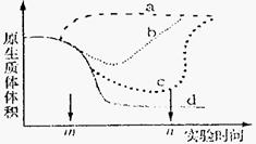 下圖表示以洋蔥表皮為材料,0.3g/mL蔗糖溶液、0.5g/mL蔗糖溶液、0.3g/mL尿素溶液及清水進(jìn)行相關(guān)實(shí)驗(yàn)(時(shí)間m表示開始用四種溶液分別處理洋蔥表皮;時(shí)間n表示都用清水處理洋蔥表皮),測(cè)得該細(xì)胞原生質(zhì)體體積變化,按照a、b、c、d的順序分析正確的是 ( )