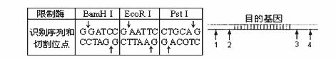 下表為幾種限制性核酸內(nèi)切酶識(shí)別的序列和切割的位點(diǎn)。如圖,已知某DNA在目的基因的兩端1、2、3、4四處有BamHⅠ或EcoRⅠ或PstⅠ的酶切位點(diǎn),F(xiàn)用BamHⅠ和EcoRⅠ兩種酶同時(shí)切割該DNA片段(假設(shè)所用的酶均可將識(shí)別位點(diǎn)完全切開),下列各種酶切位點(diǎn)情況中,可以防止酶切后單個(gè)含目的基因的DNA片段自身連接成環(huán)狀的是 ( )