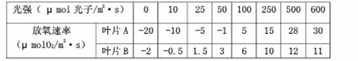 現(xiàn)有陽生和陰生植物兩種。從這兩種植物上各取一片彼此相似葉片,分別放在兩個透明盒子中。在適宜溫度條件下,逐漸增加光照強度,測定放氧速率的數(shù)據(jù)如下表。下列相關(guān)敘述錯誤的是( )