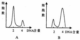 A圖表示某種哺乳動物細(xì)胞在正常培養(yǎng)時所測得的細(xì)胞中DNA含量與細(xì)胞數(shù)的變化。用某種化合物處理培養(yǎng)著的細(xì)胞,結(jié)果DNA含量與細(xì)胞數(shù)的變化如B圖所示,該化合物所起的作用是