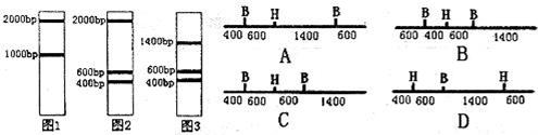 現(xiàn)有一長度為3000堿基對(bp)的線性DNA分子,用限制性核酸內(nèi)切酶切后,進(jìn)行凝膠電泳,使降解產(chǎn)物分開。用酶H單獨(dú)酶切,結(jié)果如圖l。用酶B單獨(dú)酶切,結(jié)果如圖2。用酶H和酶B同時(shí)酶切,結(jié)果如圖3。該DNA分子的結(jié)構(gòu)及其酶切圖譜是