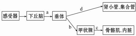 以下為人體的體溫與水鹽平衡調節(jié)示意圖,a、b、c、d代表各激素。有關敘述不正確的是( )