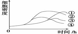 為研究酵母菌種群密度的動態(tài)變化,某同學(xué)按下表所列條件進(jìn)行了甲、乙、丙和丁共4組實(shí)驗(yàn),用1 000 mL錐形瓶作為培養(yǎng)器皿,棉塞封口,在25℃下靜置培養(yǎng),其他實(shí)驗(yàn)條件均相同,定時用血細(xì)胞計(jì)數(shù)板計(jì)數(shù)。根據(jù)實(shí)驗(yàn)結(jié)果繪出的酵母菌種群密度變化曲線如圖所示。四條曲線對應(yīng)的條件分別是 ( )