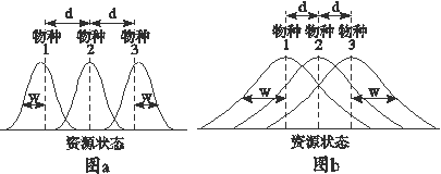 下圖表示3個共存物種的資源利用曲線,在圖a和圖b中,3個物種的資源利用狀況不同。下面是對圖a中3個物種與圖b中3個物種相比較的幾種說法,正確的是( )
