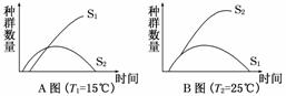 (1)研究人員將S1與S2兩個(gè)種群放在一起培養(yǎng),在環(huán)境溫度為T1和T2條件下,測(cè)得種群數(shù)量變化如圖中A圖與B圖所示。