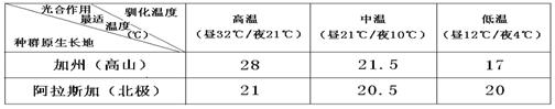 將采自加州和阿拉斯加的腎葉山蓼種子,在相同環(huán)境中培養(yǎng)4個(gè)月,任其萌發(fā)和生長(zhǎng)。然后分成三組分別放在不同溫度條件下馴化。生長(zhǎng)5~6個(gè)月后,研究馴化溫度對(duì)不同地區(qū)腎葉山蓼光合作用最適溫度的影響。測(cè)定光合作用最適溫度,實(shí)驗(yàn)結(jié)果如下表。有關(guān)推測(cè)不能成立的是( )