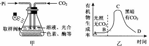科學(xué)家在研究光合作用時(shí),做了一個(gè)如下圖所示的實(shí)驗(yàn)。實(shí)驗(yàn)前,他向一個(gè)密閉容器的溶液中加進(jìn)了ADP、磷酸鹽、光合色素及有關(guān)的酶等(見(jiàn)圖甲)。實(shí)驗(yàn)時(shí),按圖乙的限制條件(光照、CO2等)進(jìn)行,并不斷測(cè)定有機(jī)物的生成率。隨著時(shí)間的推移,繪出了曲線圖(見(jiàn)圖乙)。下列對(duì)此有關(guān)的描述不正確的是